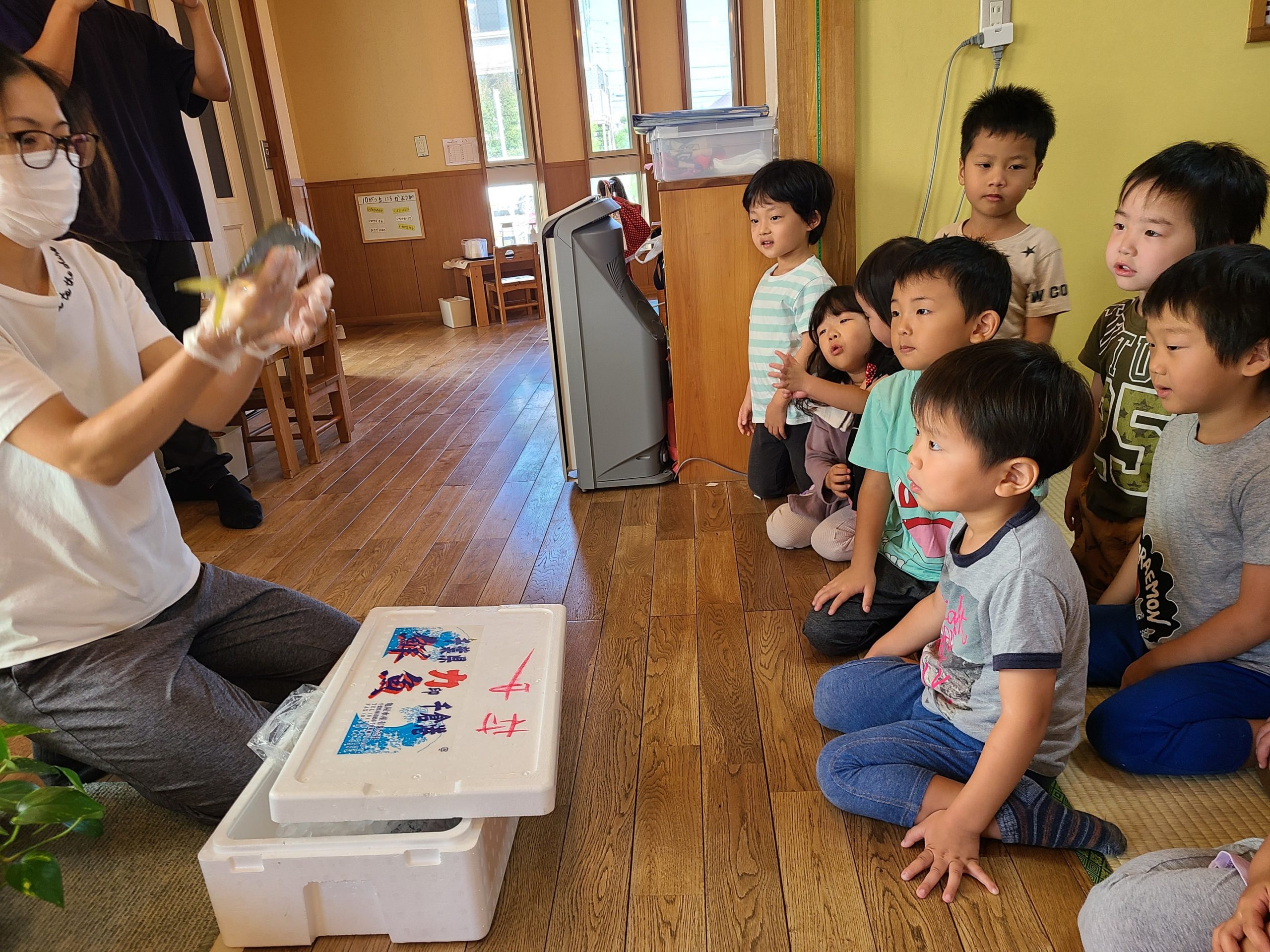 毎月のお魚の日を楽しみにしてくれている子ども達。今日の仕入れは【シマアジ・さわら・むきエビ・白エビ・アサリ・鯛切身】です。戸外で沢山遊んで帰ってくると一目散にランチに向かう子ども達でした!(鯛は離乳食用です)