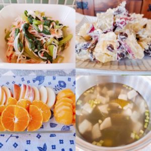 ☆小松菜とカニカマの和え物☆さつま芋とレーズンのサラダ☆りんご.柿.みかん☆カブとワカメのスープ