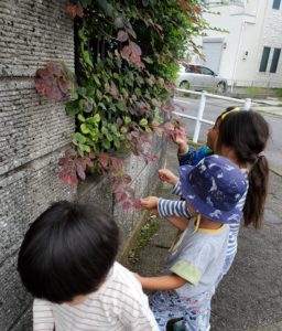 秋になると葉っぱの色はどんな色になるかな?と子ども達に聞いてみると〝赤〟〝黄色〟〝ピンク〟〝紫〟と色んな答えが返ってきました。そこで今日は秋探しのお散歩に出かけました。歩き始めると色んなものを発見していた子ども達。ご近所さんの花壇に「ピンクの花み~つけた!」と嬉しそうでした。