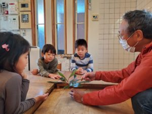 【びわの葉っぱ】に、【クリスマスローズの葉っぱ】だよ😊とそれぞれの葉っぱを手に取り、見せてもらうと「表と裏の葉っぱの色が違う!」「何かギザギザしてるよ~」と気付きや発見をする子ども達。☚その、ノコギリみたいなところの事を【鋸歯(きょし)】っていうんだよ。と安藤先生が教えてくれました。こんなふうにアトリエ教室では色んな事を楽しく学んでいる子ども達です♬