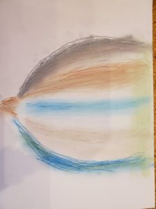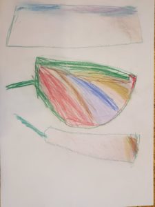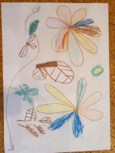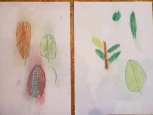 5歳児のアトリエの日がありました。本物の葉を実際に見ながら、パステルを使って絵を描き色のぼかし方や混ざり方を学びました。
