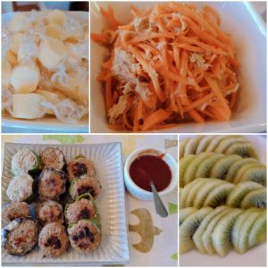 ○ピーマンと長茄子の肉詰め○チーズ○人参サラダ○果物