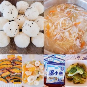 ☆白菜と鶏肉のあんかけ麵☆おにぎり☆茹でブロッコリー☆南瓜のバターソテー☆小魚☆フルーツポンチ
