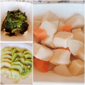 ☆5倍粥☆お麩の澄まし汁☆鶏ささみと野菜煮☆コロコロさつま芋☆高野豆腐のほうれん草添え☆キウイフルーツ