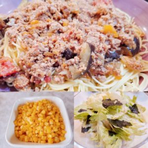 ☆秋茄子ミートスパゲッティ☆コーンバターソテー☆レタスのりサラダ