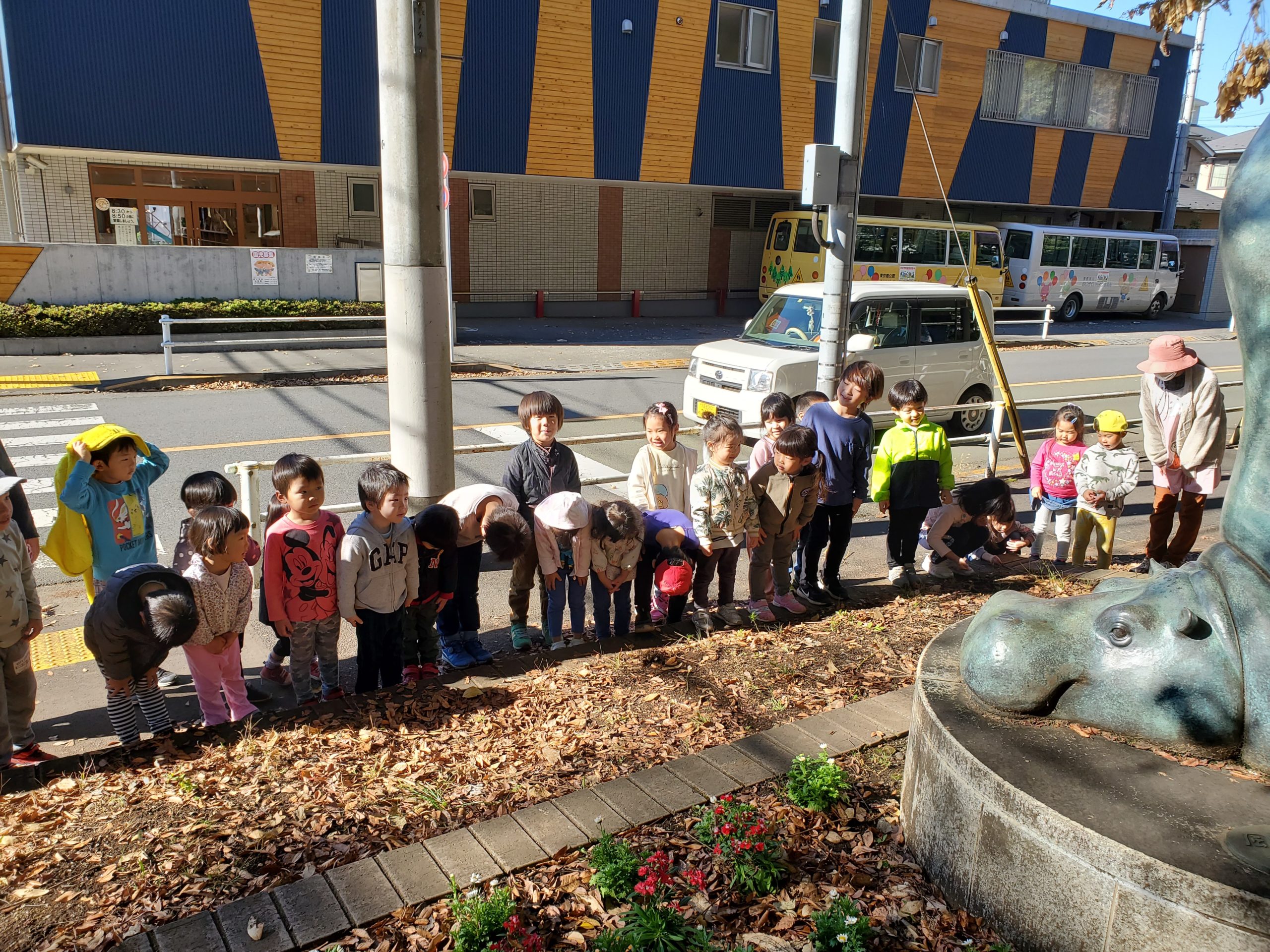 久しぶりのかばさん公園だったので初めに逆立ちかばさんにご挨拶。年長さんの男の子が代表して「これからも宜しくお願いします」と切り出すとみんなも「お願いします!」と挨拶をしていました。