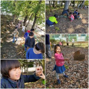 探検に出かけると楽しい発見がいっぱい♪どんぐり帽子の中にてんとう虫発見!寒さから身を守っていたのかな⁈(左下) 「お魚釣れたー!」と落ち葉の大きな魚を釣っていました。(右下) サクサクの落ち葉を踏み歩き、「気持ちいい~」と感触を楽しんでいました♪(左上) ひとたびどんぐり拾いが始まるとみんな無心で拾い集めていました(右上)