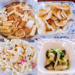 ☆秋野菜の味噌汁☆白菜と青梗菜の磯和え☆カラフルマカロニサラダ☆バナナチップ