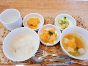【後期】☆さつま芋粥☆秋野菜の味噌汁上澄み☆鮭と根菜のやわらか煮☆白菜のおかか和え☆柿