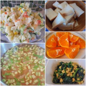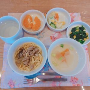 【後期】舞茸と豚挽き肉のパスタ☆カブと人参のスープ☆ポテトサラダ☆ほうれん草のソテー☆みかん