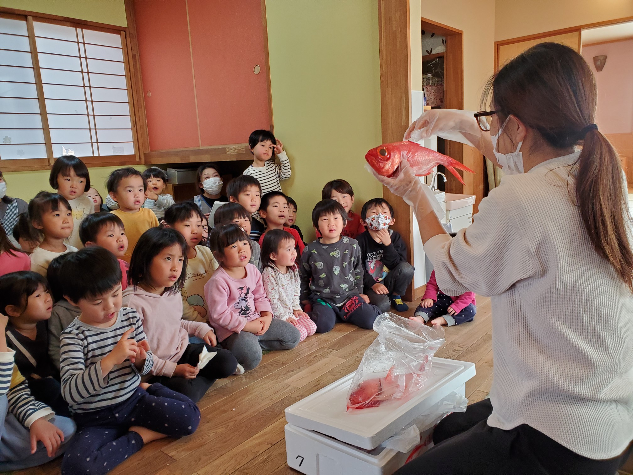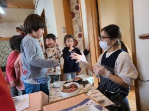 今年最後のお魚の日は、良い金目鯛が手に入りました。金目鯛の大きくてキラキラした目に釘付けの子ども達です(@_@) ランチの時間が近づくと煮付けのいい匂いが漂ってきて、「あ~いい匂~い♪」と楽しみにしてランチルームに向かうのでした。