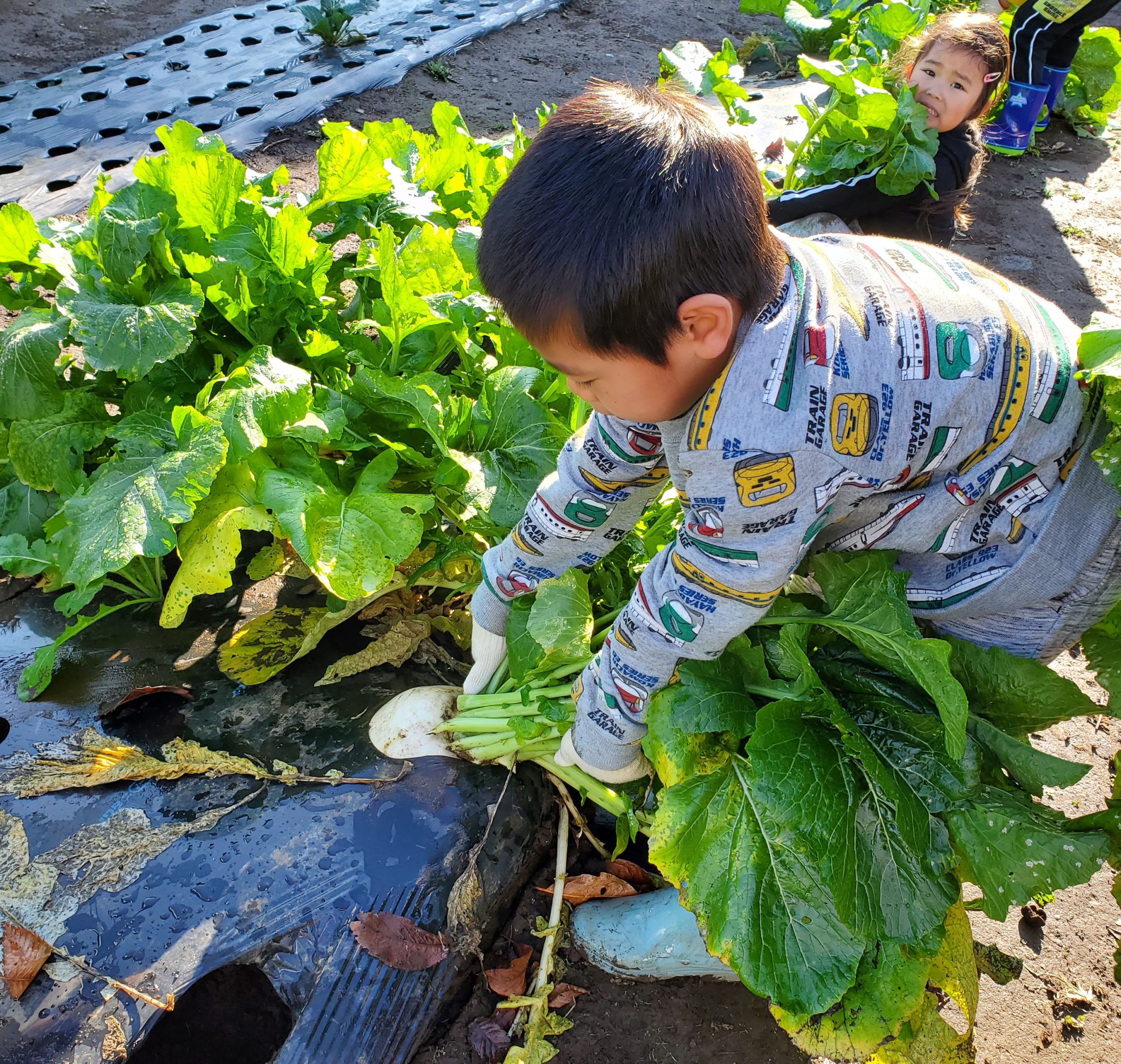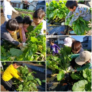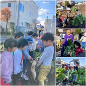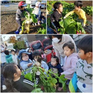4.5歳児の大きい子ども達が育ててきた大かぶと練馬大根が収穫の時期を迎えました。「どれくらい大きくなってるんだろう?」「みんなで協力しないと抜けないかも~」「優しく抜こう」と収穫を前に想像を膨らませる子ども達。しかし現実は想像を遥かに超えるものでした!全身の力を集中させて「よいしょー!」と引っ張るも1回では抜けず、それでも諦めずに何度何度も挑戦していました。一人で持つのが大変な位の大きなかぶや大根がた~くさん抜け大収穫となりました。「あんなに小っちゃな種だったのに…」としみじみと野菜の生長をかみしめる子ども達です。小さい子達もその姿に「大きい子達頑張れー!」と声援を送ってくれました。自分たちも大きくなったらああやって野菜を育てたいと期待をする声が聞こえてきました。大きい子の姿を見て意欲を燃やしています🔥大きい子にとっても小さい子にとってもとても貴重な経験をさせてもらった一日でした。畑のおじさん(島田さん)、保護者の皆さん、そして小さい子達、御協力ありがとうございました!明日は収穫祭を行いまーす☆ぜひ足を運んでくださいね~!(^^)!