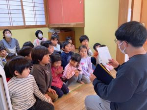 “サンタさんはとっても恥ずかしがり屋です。「こっそりプレゼントを入れられるようにみんな袋を持ってきてくれるそうじゃな。