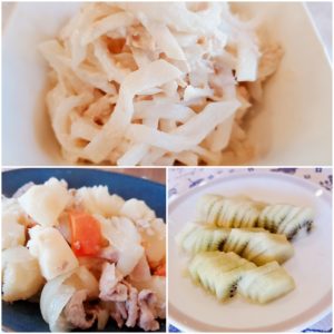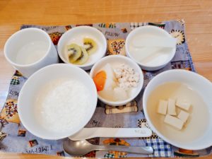 【中期】〇5倍粥〇豆腐のスープ〇肉じゃが〇大根スティック〇キウイフルーツ