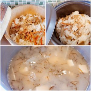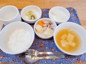 【後期】〇舞茸の炊き込み粥〇豆腐の味噌汁〇肉じゃが〇大根スティック〇キウイフルーツ