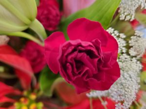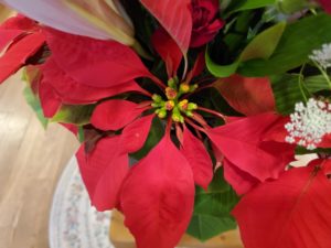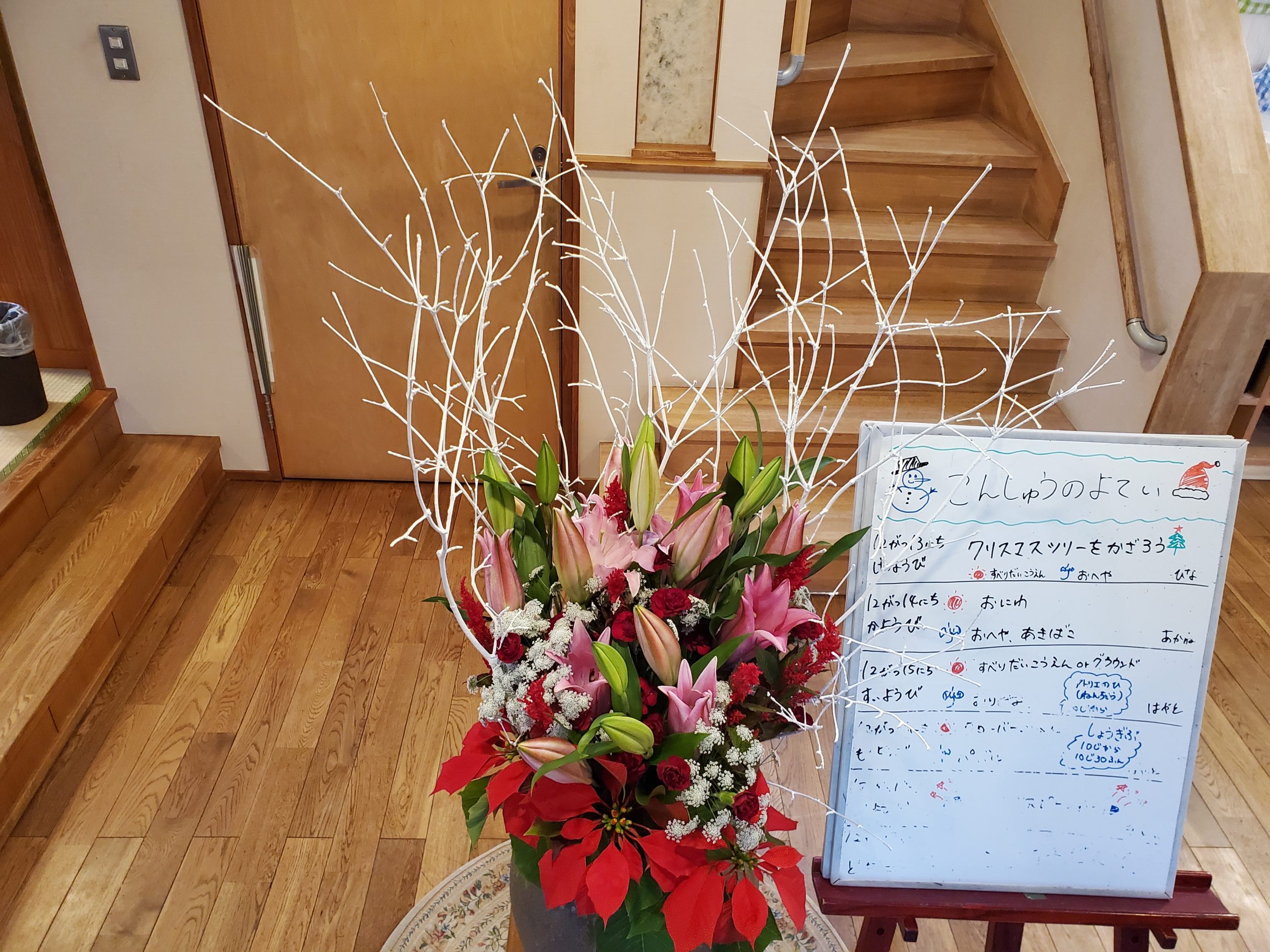 毎週火曜日お花屋さんからどんぐりの玄関にお花が届きます。今週はどんぐりのクリスマス会に合わせて素敵な花が届きました。ポインセチアカーネーション鶏頭ゆりレースフラワー塗り枝