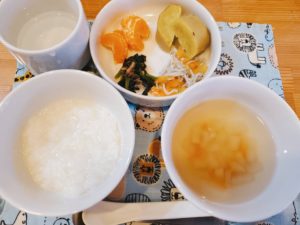 ☆5倍粥☆コンソメスープ☆しらすと野菜煮☆蒸かしさつま芋☆ほうれん草のお浸し☆みかん