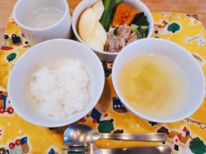 ☆豚挽き肉のきのこ炒め(青梗菜添え)☆軟飯☆中華スープ☆胡瓜スティック☆南瓜の煮物☆りんご