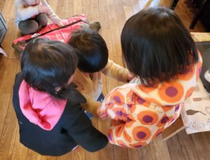 お部屋に戻ると思うように手が動かなくてジャンバーが脱げずに困っている女の子がいました・・・・・すると同じ2歳児で仲良しの男の子と女の子がその様子に気付きそっと助けてあげていました😊