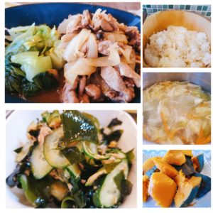 ☆豚肉ときのこの炒め(青梗菜添え)☆玄米入りご飯☆春雨中華スープ☆わかめの酢の物☆南瓜の煮物☆りんご