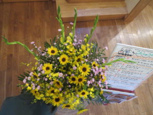 毎週火曜日お花屋さんからどんぐりの玄関にお花が届きます。今週は ひまわり 黄色いオンシジューム 紫色の孔雀草 何色か楽しみなグラジオラス 緑の葉っぱフェニックスロベニーです。