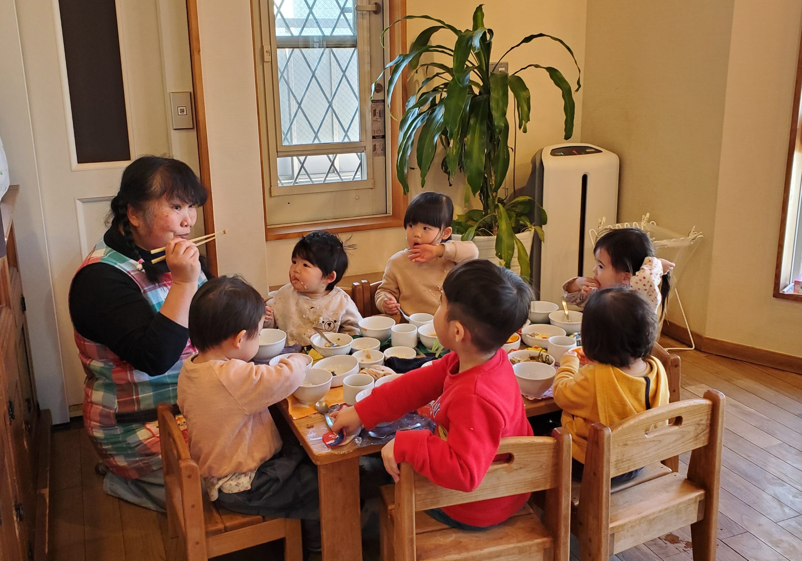 ランチオープンのベル♪が鳴るとお腹を空かせた子ども達は自分から手洗いを済ませランチルームへと向かいます!一番大きいテーブルには自然と子ども達が集まり離乳食の子と一緒にお兄ちゃんお姉ちゃん、そして大人も一緒にランチを楽しんでいる様子が見られました😊まるで大家族のようで、お互の温もりを感じながら心も身体もポッカポカになったんだろうなぁ~(*’▽’)と感じる瞬間でした☆