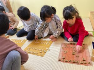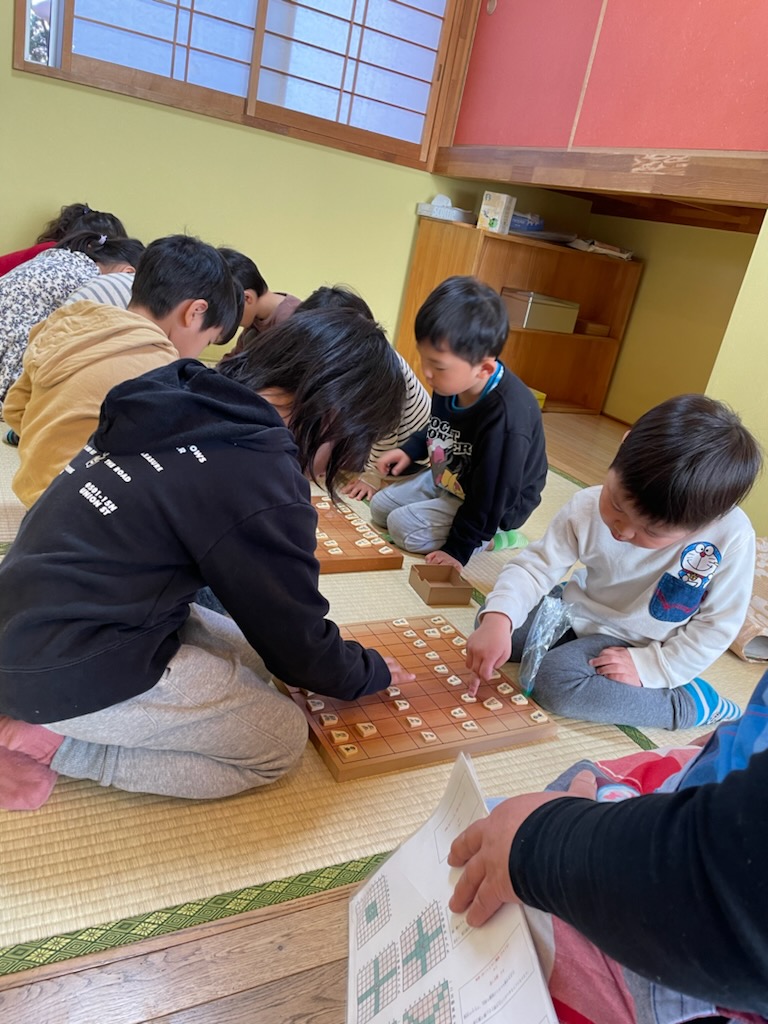この将棋部の一番の良い所は、自分だけがわかって強くなればいいというわけではなく、わからない子には周りの子が教えてあげたり、気づかせてあげたりしながら一緒に楽しんでいる所だと思います。対局が始まるとみんな真剣な表情で将棋盤を見つめ考えながら駒を進めていました☖最後には「○○君上手だった」「駒がとれて楽しかった」「次は玉をとられないように守る」と話し充実しているようでした!(^^)!