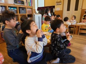 今日は節分です。みんなで豆まきをしたりヒイラギを飾ったり、恵方巻を食べたりして一年の無病息災とみんなの幸福を願いました。