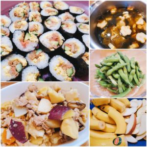 ☆恵方巻き☆わかめとお麩の澄まし汁☆鶏肉と根菜の煮物☆枝豆☆バナナとりんご
