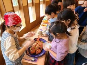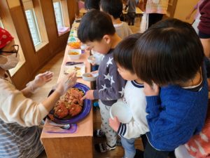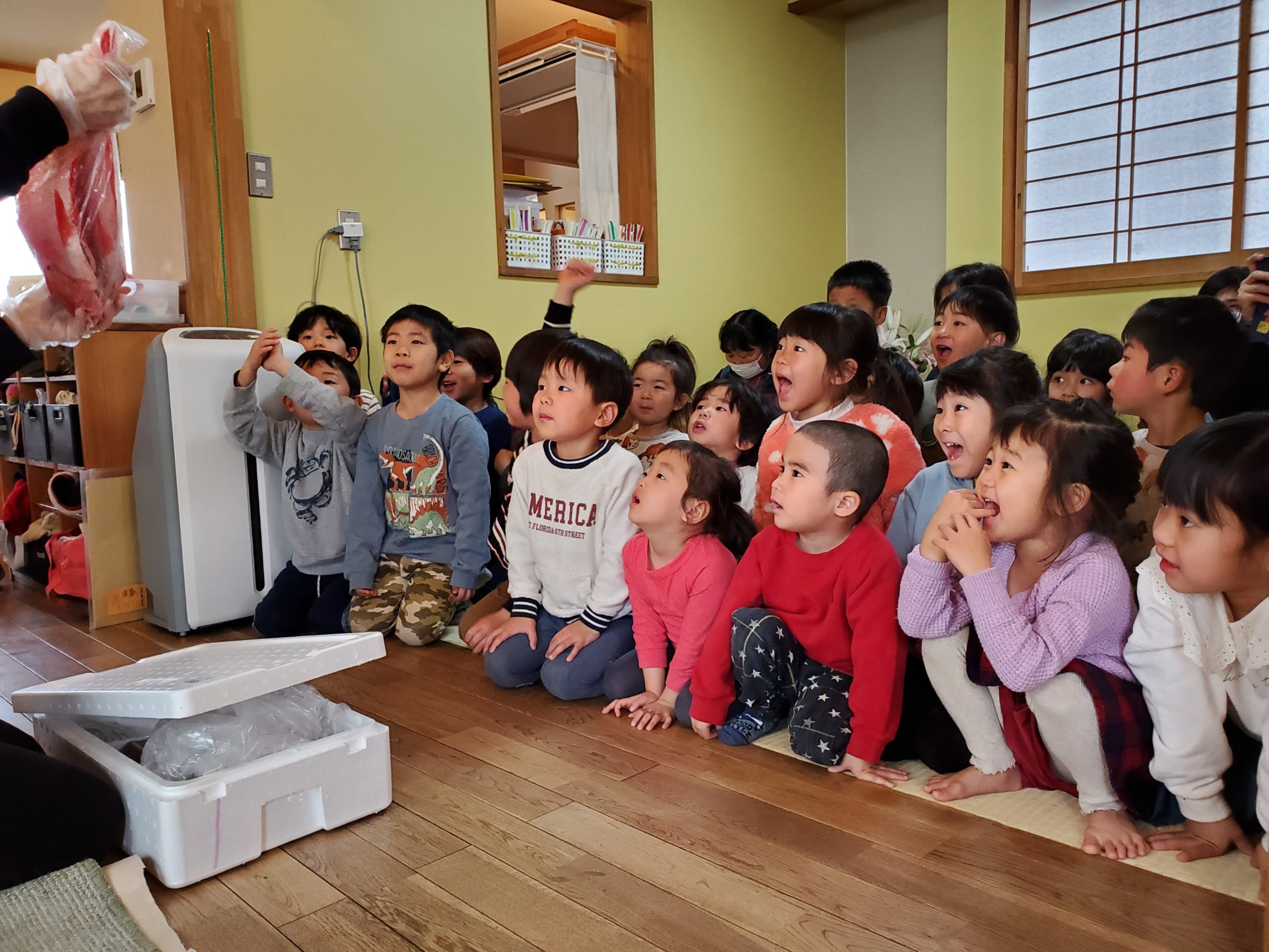 市場で新鮮なお魚を仕入れて来ました。「目をキラッキラさせて『みんなに会いたいなぁ』って言ってるみたいだったから連れて来ちゃった!」と登場したのは立派な金目鯛!「おっきい~」と目をま~るくしていました👀 他にも今が一番おいしい鱈やサバを仕入れて来ました。お散歩から帰ってくると「う~んいい匂い♪」と食欲を掻き立てられてた子ども達です☆