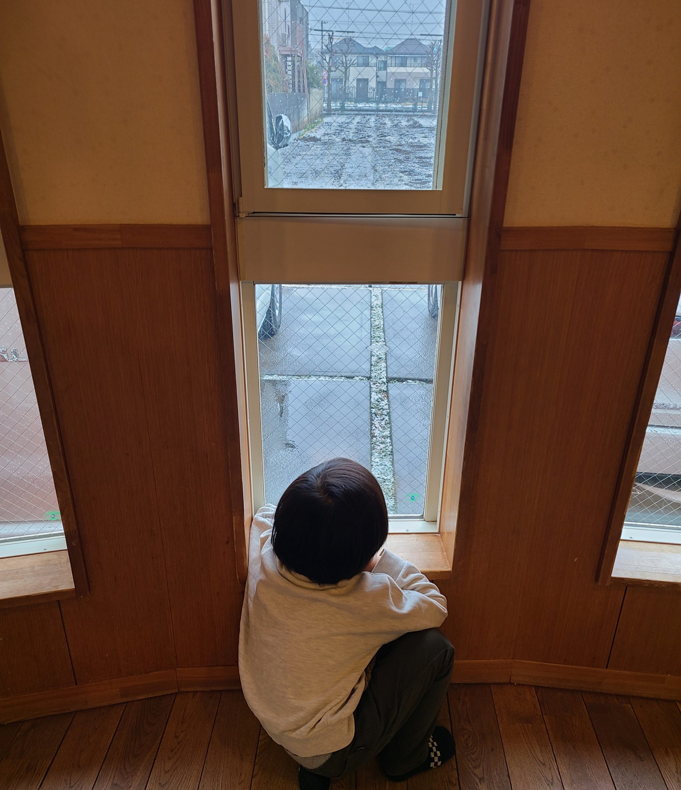 窓の外が気になり、少しずつ畑が白くなっていく様子をじっと眺めていた子ども達です😊