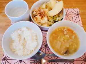 ☆軟飯☆豚汁☆豆腐ソテー(おかか添え)☆粉ふき芋☆キャベツの海苔和え☆りんご