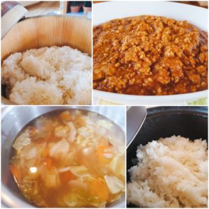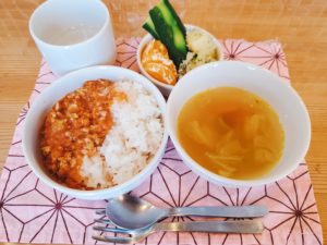 ☆豚挽き肉のトマトライス(軟飯)☆野菜スープ☆青のりポテト☆スティック胡瓜☆オレンジ