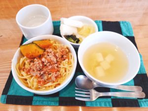 【後期/完了期】☆ミートソーススパゲティー☆コーンの豆腐のスープ☆蒸かし南瓜☆キャベツの海苔和え☆パン☆果物(はるか)