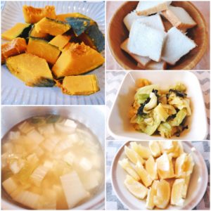 ☆コーンと豆腐のスープ☆蒸かし南瓜☆キャベツの海苔和え☆パン☆果物(はるか)