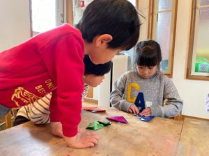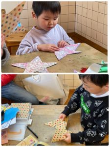 △に折った三つの折り紙をどう組み合わせたら星の形になるんだろう…と何分も悪戦苦闘しながら最後まで頑張って仕上げていました!「みんな凄いなぁ。頑張ったなぁ」と褒めてもらい達成感を味わっている子ども達でした☆彡