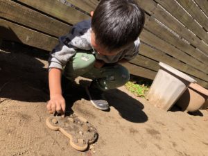 「なにに見えるでしょーか??」とお庭にあった砂と石を使って作っていました😊