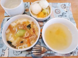 ☆五目うどん☆ころころおにぎり☆春キャベツのおかか和え☆野菜スープ☆伊予柑