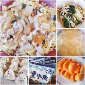 ☆五目あんかけ焼きそば☆野菜中華スープ☆ゴマ塩おにぎり☆春キャベツとわかめのナムル☆小魚☆伊予柑