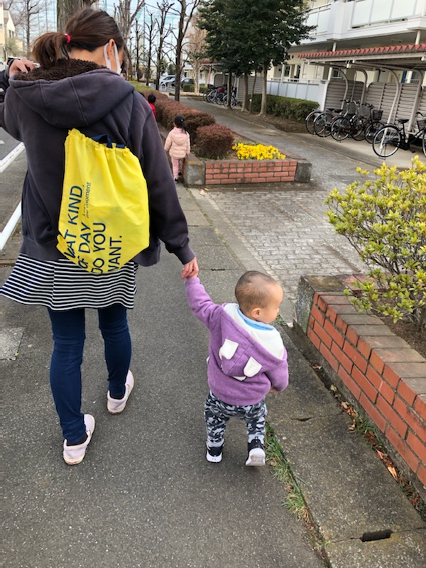 1才2ヶ月を過ぎた男の子。今日は大きい子達の後ろからスタッフと手を繋ぎ、クローバ公園まで歩きました👏 時々つまずきながらも自分で立ち上がり歩くことを楽しんでいました☺ 自分で歩くことで身体が丈夫になり忍耐力もつきます!これから暖かくなるので春の自然を満喫しながらたくさん歩くことを楽しみたいと思います✨
