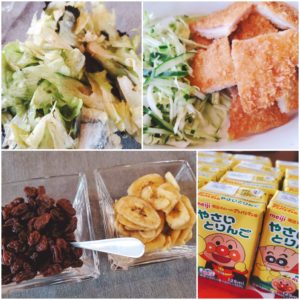 ☆レタスのりサラダ☆バナナチップス☆レーズン☆野菜ジュース