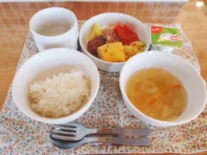 ☆白米☆野菜スープ☆ハンバーグ☆コーンとキャベツのソテー☆茹でキャベツとミニトマト☆バナナ☆ベビーダノン