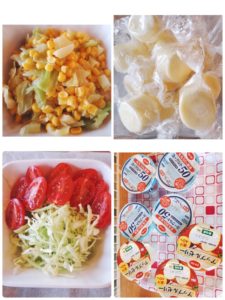 ☆コーンとキャベツのソテー☆千切りキャベツとミニトマト☆チーズ☆ヨーグルトorゼリー