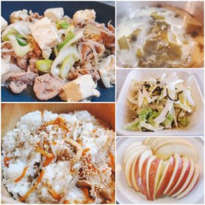 ☆肉豆腐☆牛蒡ときのこの炊き込みご飯☆大根とわかめの味噌汁☆白菜の塩昆布和え☆りんご