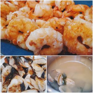 ☆むきエビのソテー☆サワラと鯖の塩焼き☆あさりとわかめの味噌汁