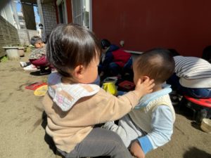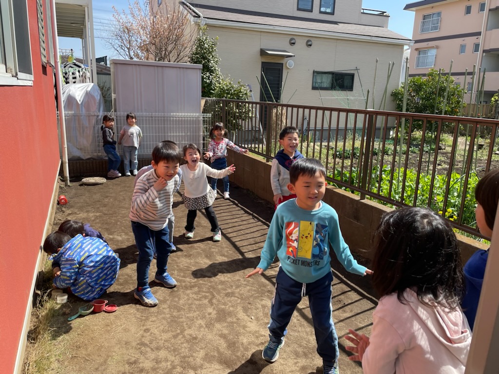 今日はお庭で過ごしました。朝は風が肌寒く感じましたが日中はポカポカ暖かい日差しが降り注いでいました。そんな中お庭には「だ~るまさんがこ~ろんだ!」の声が響き、大きい子達が大盛り上がりを見せていました😊