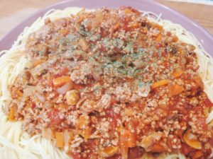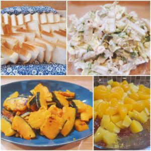 ☆ミートソーススパゲティー☆食パン☆白菜のサラダ☆南瓜のソテー☆野菜ジュース☆フルーツゼリー