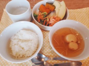☆えのきとお麩の澄まし汁☆南瓜の煮物☆春キャベツと新人参の胡麻和え☆リンゴ