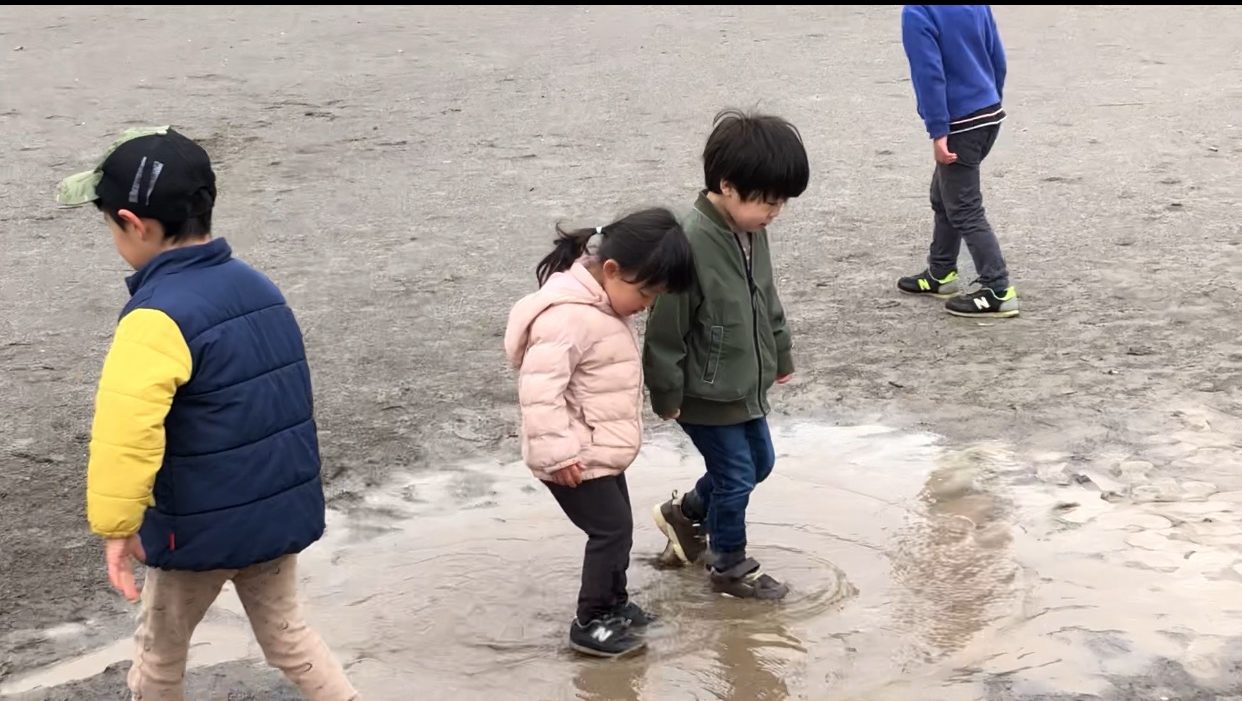 昨日の雨が溜まっていて水たまりになっていたところにドカドカと入り込む子どもたち(笑)