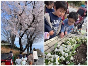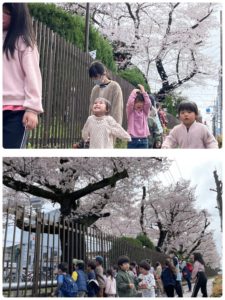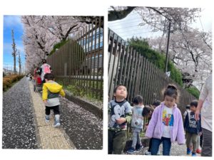 どこの桜が一番心に残るかな…と、ワクワクしながら出かけました。遠くの方に桜の木を見つけると、「あっちに桜が見える!あっちに行ってみよう!」と、桜を目指して進む子ども達です。風に吹かれて舞う桜の花びらが日常の風景を彩ってくれますね✨